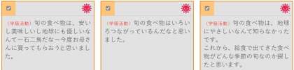 発表ノートを使い、グループで相談しながら、野菜や果物などを旬で分け、旬の食べ物のよさについて考えました。