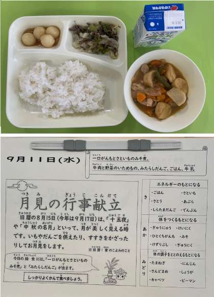 少し早い月見の行事献立でしたが、みそ煮には、旬のさといもを使っています。