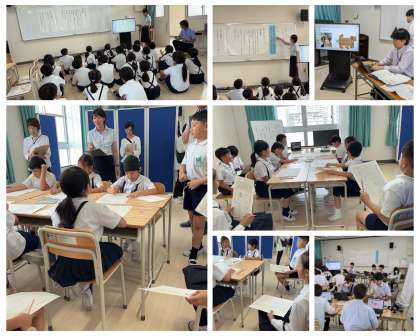 第5回授業研究会は3年生国語「グループの合言葉を決めよう」の単元で、話し合いの進め方を学びます。司会の進行にそって互いの意見の共通点や相違点に着目して、意見をまとめることに取り組みました。「全校オリエンテーリング」「ドッジボール大会」「わくわくタイム」の活動を盛り上げる「合言葉」を決めていきました。話し合いのようすと見ていた友だちからよかったこと、改善したらいいことなどを聞くことで、次の話し合いに臨むモチベーションにつながりました。和歌山大学の豊田充崇先生から話し合い活動を活性化させるためには場面の設定に切実感を持たせること、思考ツールを活用して一人一人の考えを可視化し、テーマに即した内容となっているか意識させることが大切であると指導いただきました。また、今回の研究協議会から参加者の意見共有ツールとして、「CANVA」を活用しています。