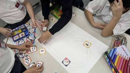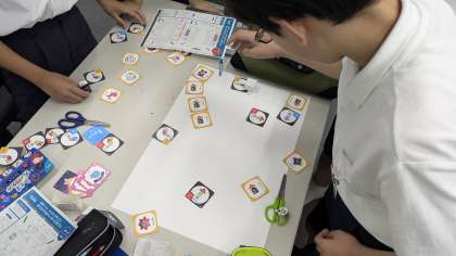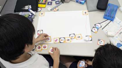 プログラムのカードを机に配置しロボットを上にのせると、命令にしたがいロボットが動き出します。