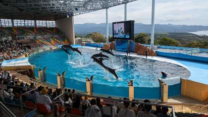 10頭近くのイルカによるショーを楽しみました。これだけ多くのイルカが一斉にジャンプする姿は迫力満点でした。いつまでもイルカが自由に泳げる海を守らなければと感じました。