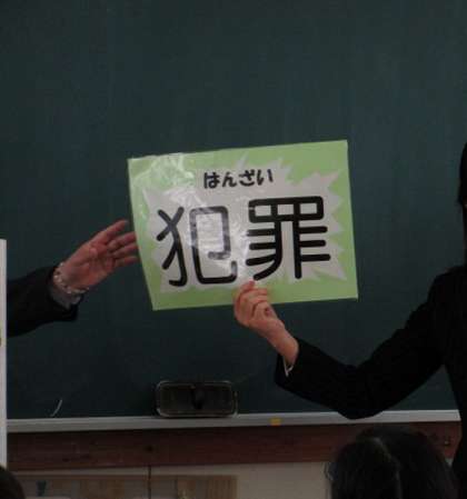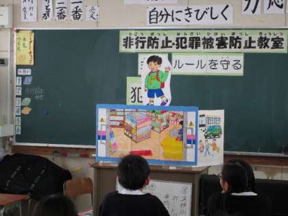 授業は、ペープサートを使って、万引きは犯罪であること、被害者や家族の気持ちを考えること(思いやりの気持ち)の大切さを学びます。非行に誘われた時、勇気をもって考えることの大切さを学びました。
