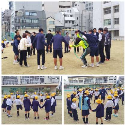 今日の児童集会は「フラフープくぐり」です。