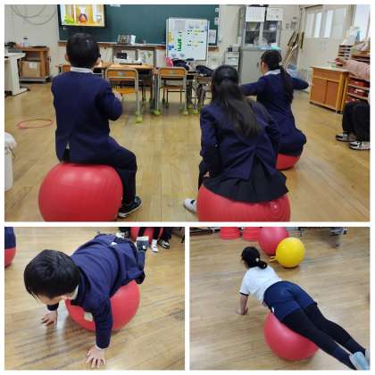 動画を見ながら音楽に合わせてバランスボールの上で体を動かしたり、筋トレをしたり…