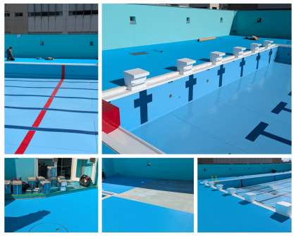 プール内の塗装が終わり、プールサイドにウレタンシートを敷き詰めています。