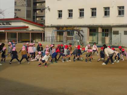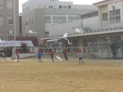 寒い日が続きますが、幼稚園の子どもたちは元気いっぱいです。小学校の校庭でマラソンしたり、凧揚げをしたり、外で体を動かして遊んでいます。