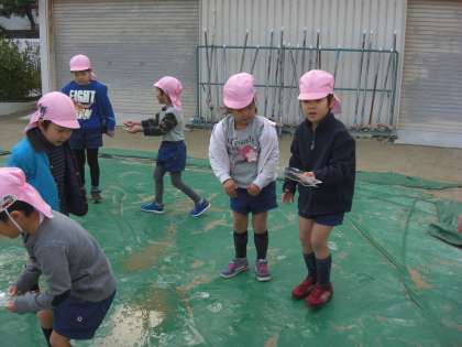 小学校の砂場のシートに昨日の雨でできた水たまりが、今朝になると凍っていました。子どもたちは、「氷ができてる」と大はしゃぎ。氷を手に取りながら「冷たい!」「ガラスみたい」「なんか泡の模様ができている」と冷たい氷の感触を楽しんでいました。