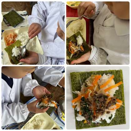 コチジャンで味つけした牛肉ともやしとにんじんのナムルを巻きます。1年生も頑張って作っていましたね。