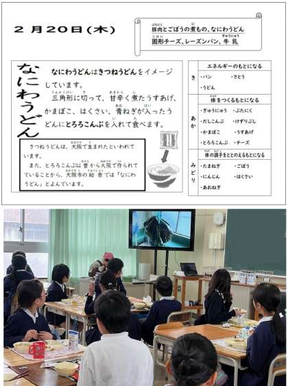 「なにわうどん」は大阪の食文化を紹介する大阪市独自の献立です。甘辛く炊いた三角形のうすあげととろろこんぶが特徴です。