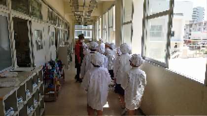 6年生は1年生に優しく給食を届けていました。