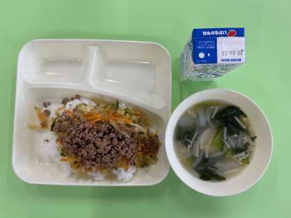 今日の献立は「ビビンバ、トック、牛乳」でした。切干しだいこん、にんじん、きゅうりのナムルとコチジャンなどで甘辛く味付けしたひき肉をごはんにのせ、混ぜながら食べます。