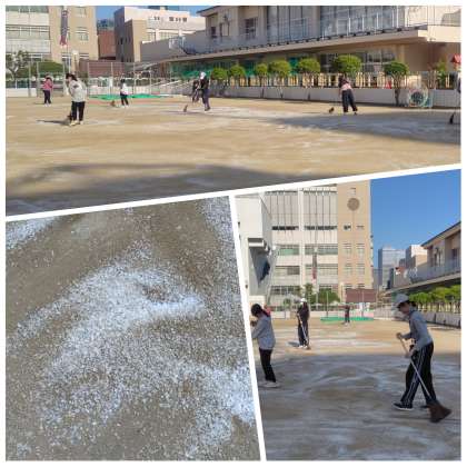 5月の運動会に向け、教職員で「にがりまき」を行いました。