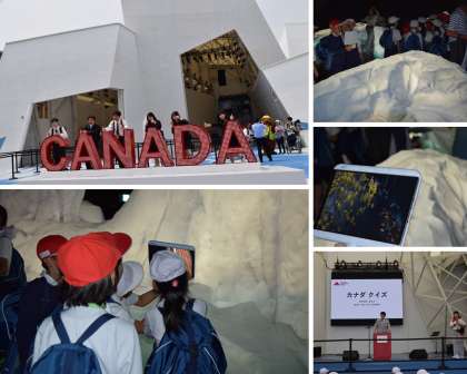 1・6年、2・4年グループは、カナダ館を見学しました。クイズを解きながらカナダへの関心が高まった後に、氷山の中を歩いていくアトラクションを楽しみました。氷山にタブレットをかざすと、カナダの自然や文化、人々の生活のようすを知ることができました。
