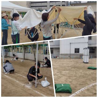 北稜中学校から運んできたテントを放課後、教職員で設営しました。