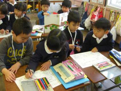 ばらぐみさんが体験入学で滝川小学校に行きました。初めに1年生の教室で、国語の体験学習を受けました。「スイミー」の音読を聞いたり、絵本を読んでもらったり、一緒に色ぬりをしてもらいました。その後、講堂で5年生のお兄さん、お姉さんと一緒に縄跳びをしたり、はないちもんめをしたり、じゃんけん列車をして遊びました。幼稚園に帰ってきたばらぐみさんは、「たのしかった〜」「お兄ちゃん、お姉ちゃん、かっこよかった〜」と小学校生活への期待に胸を膨らませていました。