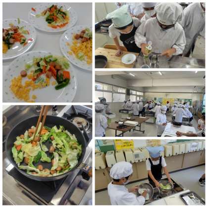 野菜炒めを作るチーム、スクランブルエッグを作るチームに分かれ、自分たちで作成した工程表(役割分担表)を見ながら調理しました。