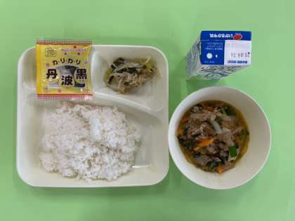 今日の献立は「ご飯、牛乳、マーボーはるさめ、チンゲンサイともやしの甘酢あえ、いり黒豆」でした。