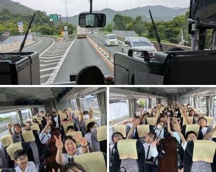 雨が降ってきましたが、1号車も2号車もレク係が中心となって盛り上がぅています。