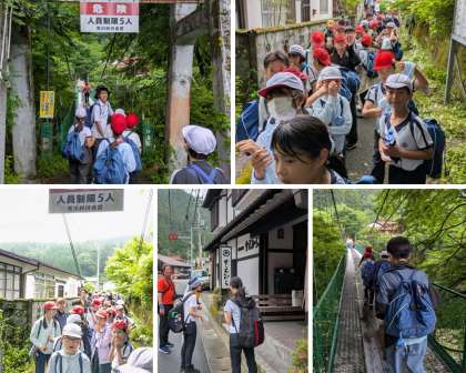おひるごはんを食べて、いよいよ宿舎に戻る後半戦です。雨がポツポツ降っていますが、エネルギーをチャージしたので、元気いっぱい歩き始めました。歩くうちにどんどん明るくなり、雨も上がりました。クライマックスは、定員5人の吊り橋です。揺れるわ、透けてるわ、スリル満点で宿舎に戻ってきました。このあとは避難訓練です。