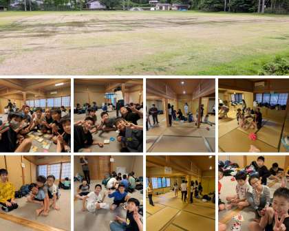 子どもたちはそれぞれの部屋でハガキを書き上げ、提出したあと、トランプやウノなどで楽しく過ごしています。グランドの状態が良くないので、キャンプファイヤーは室内オリンピック等に変更していきます。
