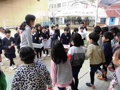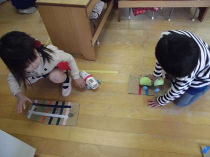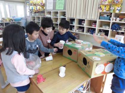 滝小2年生が、たきがわっ子まつりで遊んだ手作りのおもちゃを、プレゼントしてくれました。いただいたさくらぐみさんは、お部屋に入ってさっそく遊んでいました。