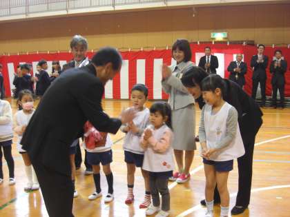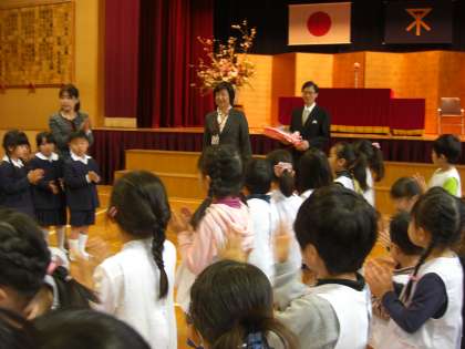 4月1日、中辻前校園長の離任式と民辻新校園長の着任式を行いました。幼稚園の子どもたちも親子で参加し、お別れとお祝いをしました。