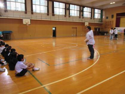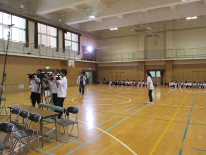5年生が講堂の後ろで番組収録の見学です。静かに見学していたみんなのところに番組ディレクターさんがやってきて、番組で使用する機材を説明してくれました。わずかな時間でしたが、収録がスタートするまでの何だか楽しげな雰囲気をみんなで感じることができました。