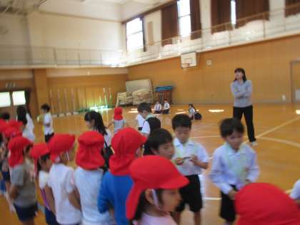 1年生と滝川幼稚園ばら組との幼小交流「はじめましての会」がありました。1年生は、この会に向けてたくさん練習を積んできました。その成果を発揮して、上手にばら組さんをリードして、楽しい会をつくりあげました。自己紹介も上手に言えました。ばら組に、「今は、先生の方をむくんだよ。」とやさしく教えてあげていました。遊びの紹介では、とてもハッスルして、講堂の中を走り回りました。自分が教えてあげる立場になると、やはり動きがちがいました。まだ入学して一か月ほどですが、少したのもしく見えた1日でした。