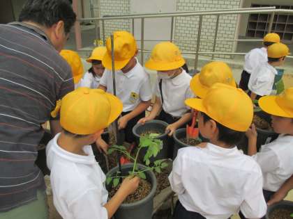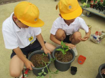 今日は、管理作業員さんにコツを教えてもらいながら、さっそく植木鉢に植え替えをしました。やさしくそっと土をかぶせて、お水をたっぷりあげました。自分の苗に、「ピーちゃん」「おこちゃま」「クララ」など、かわいい名前をつけて、さっそくかわいがっている様子です。