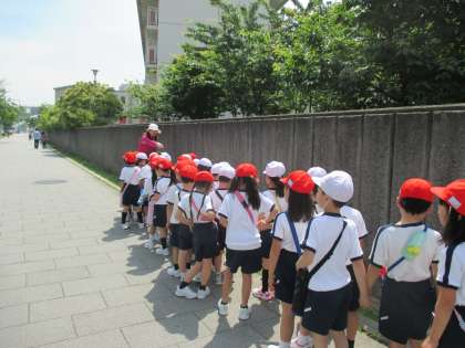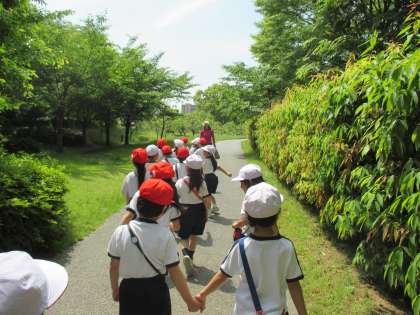 今日も、とてもよい天気でした。1年生は、来週行なわれる幼小交流の準備を進めています。今日の、2,3時間目、藤田公園に出かけて、気になるところ、ばら組さんへの声かけで注意するところなどを確かめました。花壇の壇の上をふまない、植木に近づきすぎない、階段は手を離して降りる、など確かめながら行きました。