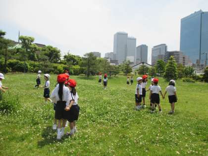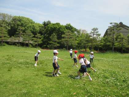 藤田公園では、当日行う遊びを確認して実際に遊びました。しろ爪草の咲く草原は、とても気持ちがよく、おもいっきり駆け回りました。終わりには、しろ爪草を摘んで、指輪を作ったり、花束を作ったりしました。2時間、おもいっきり遊んで大満足でした。