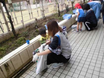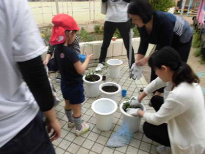 5月11日. 登園時・降園時に、親子で夏野菜の苗を植えました。実がなるのが楽しみです。