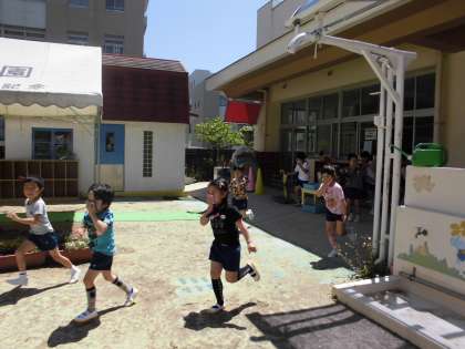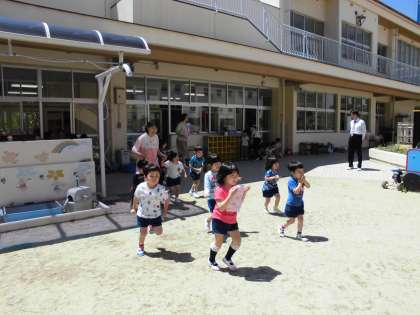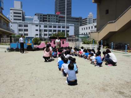5月12日. 火災に対する避難訓練をしました。非常ベルの合図で、園庭に避難しました。