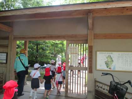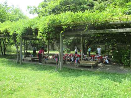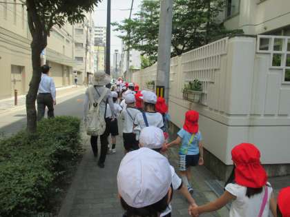 23日(月)1年生は滝川幼稚園ばら組さんと藤田公園へ行きました。1年生は、この日のために、遊びの説明の練習をしたり、はじめのことば・おわりのことばの練習をしたりしてきました。藤田公園まではいっしょに手をつないでいきます。ばら組さんを内側にして、前の人におくれないように歩いていきます。途中、いろんな注意をしながらしろつめぐさの生い茂る藤田公園へ到着しました。