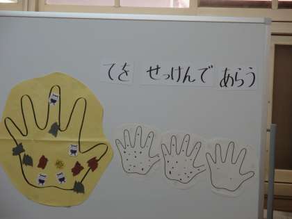 31日(火)体重測定がありました。体重測定が終了した後、引き続き保健指導を行いました。今回は「正しい手の洗い方」です。アルコールをひたした脱脂綿で、自分の手をふき目には見えない汚れを確かめました。続いて、水と石鹸では落ち方に違いがあること、そして正しい手の洗い方を学習しました。体験的な活動もあり、わかりやすい掲示物もあって、1年生にとってもよく理解ができました。