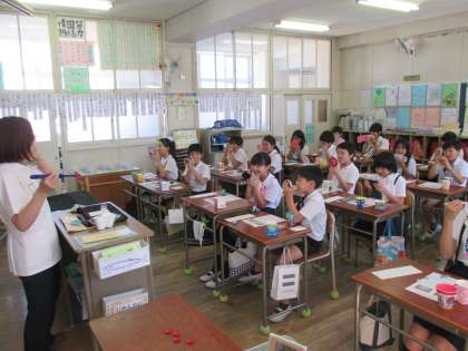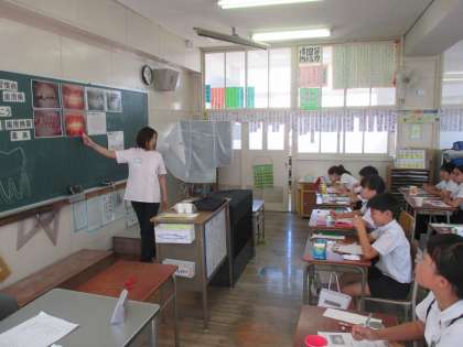 6月2日、6年生の「歯・口の健康教室」がありました。歯科衛生士さんに来ていただき、歯周病や歯・口に関する生活習慣についての話を聞きました。自分の生活をふりかえり、おやつの食べ方や食事のときのかむ回数、歯ぐきの様子を観察し、最後に前歯の歯垢染色と歯みがきをしました。ピンク色に染まった歯を見て歯垢のつき方の様子も確認でき、これからの生活習慣や歯みがきについて考えるよい機会になりました。