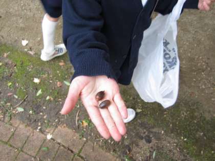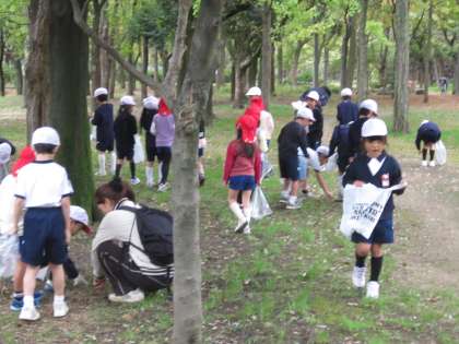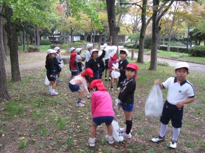 11日(月)1年生は滝川幼稚園ばら組さんといっしょに、大阪城公園へ「あきみつけ」に行きました。1年生はばら組さんと手をつないで、ちょっぴりおにいさん、おねえさんになった気分です。無事に大阪城に着くと、いっしょにどんぐりや色づいた葉っぱなどを拾いました。「ここにもあるよ。」「こっちにもあったよ。」そんな声が聞こえ、なかよく集めることができました。このどんぐりや落ち葉を使って、生活科や図工の作品作りに活かしていきます。1年生は、ばら組さんにやさしく声をかけながら、学校まで戻ってきました。今週は、急に寒くなりましたが、いっしょに活動すると、寒さも忘れてしまいます。今週は、5年生もばら組さんや同心保育園の園児との交流も予定されています。