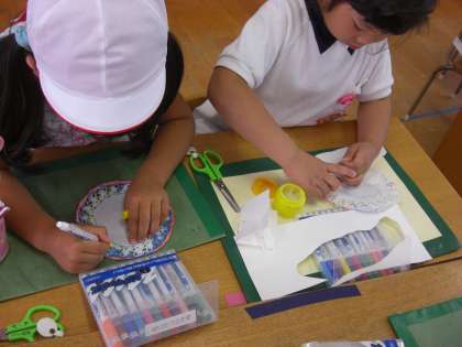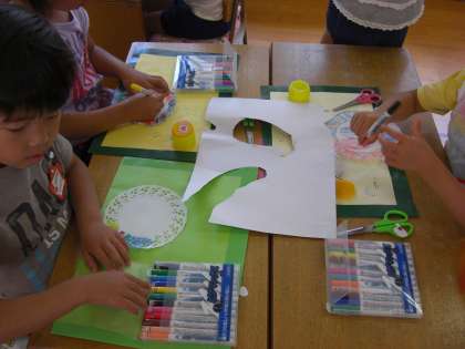 紙皿で、かたつむりの殻を作り、レースペーパーをうまく使って色を塗りました。