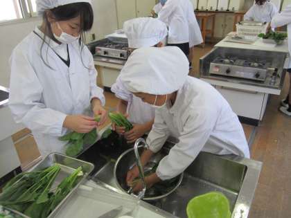 ほうれん草は、根元まで丁寧に洗い、ゆでました。ゆでる前とゆでた後のかさや色を観察し、違いに驚いていました。