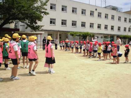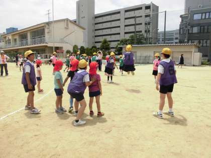 6月14日 幼稚園と小学校が「ガッツ交流」で、共に活動しました。ばら組さんが小学校を訪問して、5年生と一緒に元気に運動しました。