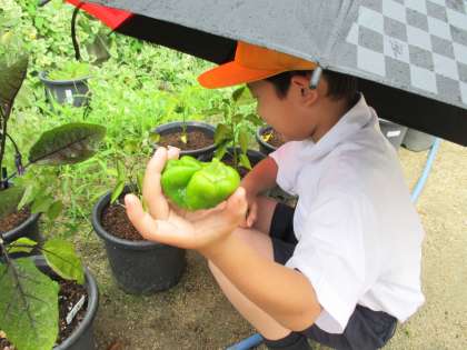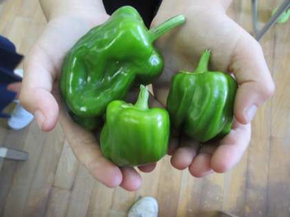 それは・・・ピーマン!!しかも、なかよく3つも収穫ができました!名付けて「ピーマン3兄弟」!つやつやの緑色で、いい香りがしました。次は、どのお野菜ができるかな?