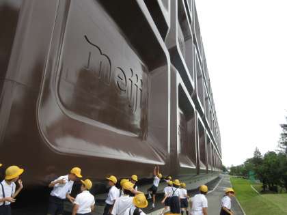 工場の外には、大きな板チョコの看板が・・。