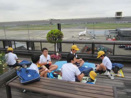 「外でお弁当を食べたい」というみんなの願いが通じたのか、直前までパラパラしていた雨も上がり、何とか、空港の展望デッキでお弁当を食べることができました。