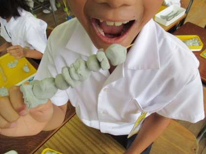 1時間目から、「ねん土定食」を見て「おなかがすいてきた〜!」と話していました♪ 片づけるときは、「もったいな〜い!」と、そのままねんどケースに保存する子も・・・!!