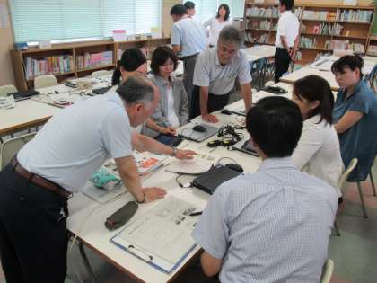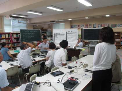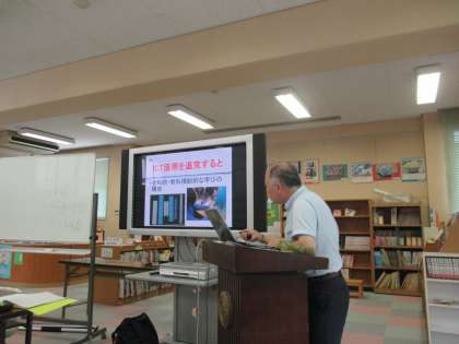 26日(火)に大阪教育大学の木原俊行先生をお招きし、ICT校内研修を実施しました。「授業におけるICTの効果的な活用」をテーマに先生からお話いただいた後、2つのグループに分かれてタブレットPCを使った授業の指導案検討をしました。今後も本校では長期休業中にICT活用研究を進めていく予定です。