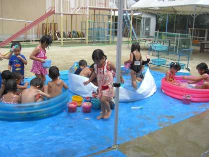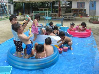 夏休み中も、一時預かり保育(タッキークラブ)を行っています。暑い日が続きますが、子どもたちは元気です。特に、水遊びは大人気です。