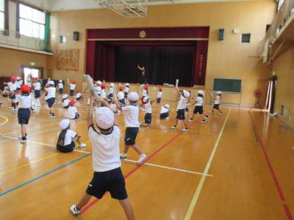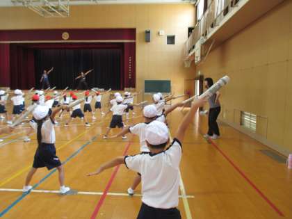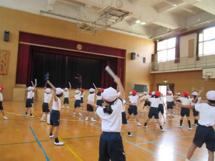 運動会に向けての練習が始まりました。1・2年生のテーマは「もっと素敵な1・2年生になるためにレッツゴー」です。そのために忍者になり修行の旅に出かけます。かわいいちびっこ忍者のしぐさは、きっと拍手をしたくなるでしょう。音楽とよくあったふりつけも乞うご期待。