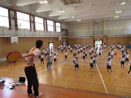 3・4年生の運動会の練習です。みんな大きな動きで体を回転したり、手足を動かしたりしていました。先生が何やら持って踊っていますね。これは「パーランクー」と呼ばれるものです。みなさんご存じですか?知っている人はどんな踊りを練習しているのか、すぐにわかりますね。