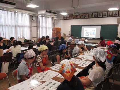 会議室でPTA給食試食会がありました。最初に堀川小学校の栄養教諭の先生にお話を伺い、その後、給食の試食をしました。今日の献立は米飯に味噌汁、野菜いため、たこの柔らか煮、牛乳でした。参加された方々は、出来立ての温かい給食を口にし、本当に満足された様子でした。