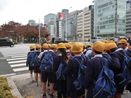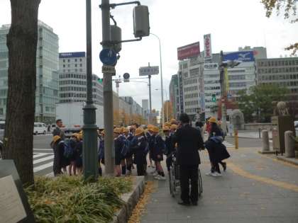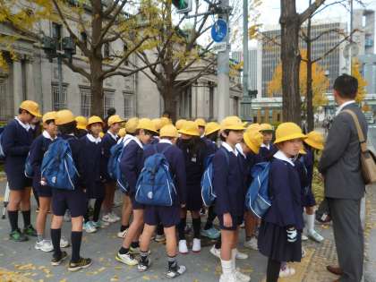 9日(月)5年生が日銀と造幣局の見学に行きました。南天満公園を横切り、天神橋からばら園を通り、日銀へ。ほぼ40分近くを歩きました。きれいな公園の中を歩きました。「大阪にもこんなきれいなところがあるんだね。」と言っているのは、先生だけで、みんなは友だちと歩くのが楽しい、といったようでした。日銀は、すごく警備が厳しく、金属探知機のチェックもありました。日銀の業務についての話を聞き、重要文化財に指定されている旧館の応接室に通されました。日銀ができたときから使っている椅子は彫刻が施され、座るのがもったいないくらいでした。次に通された部屋で、子どもたちはお金の重さや、紙幣の一生について見てふれて学びました。館内は撮影禁止ですので、写真を通して様子は伝えられませんが、よい勉強になりました。